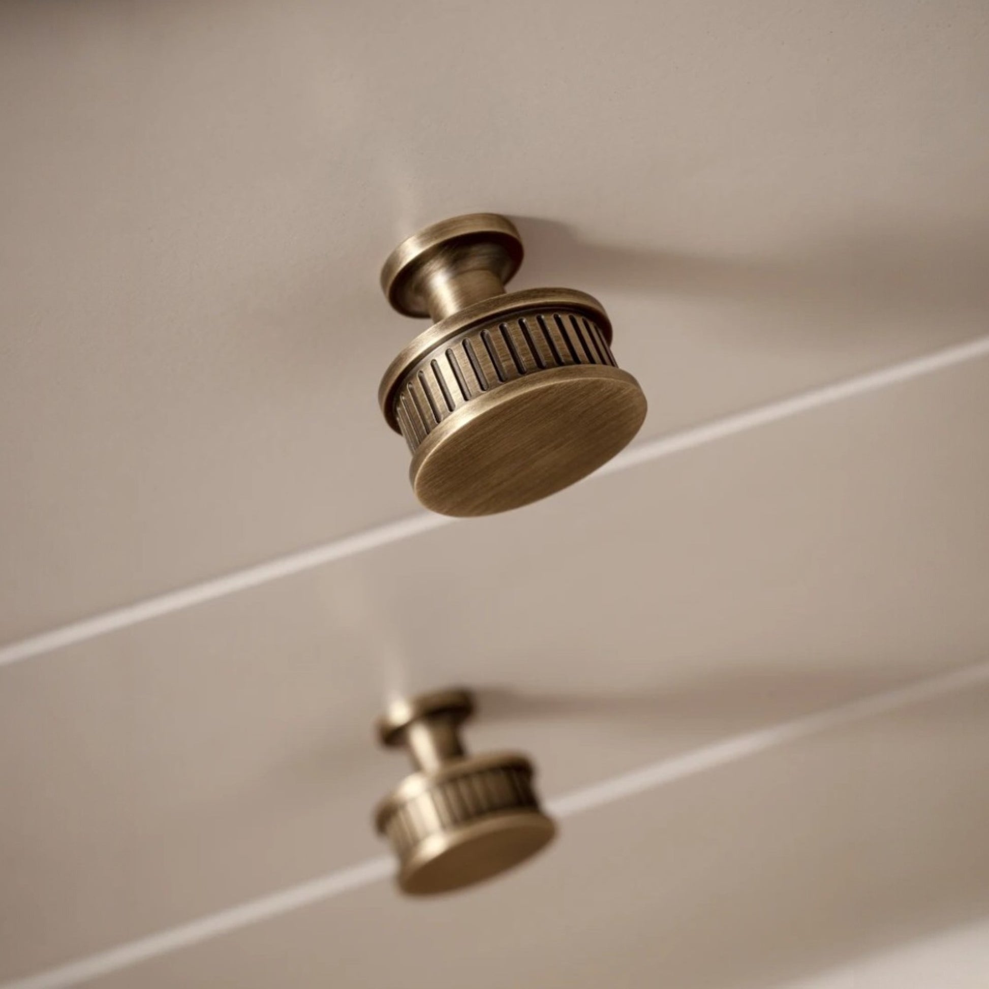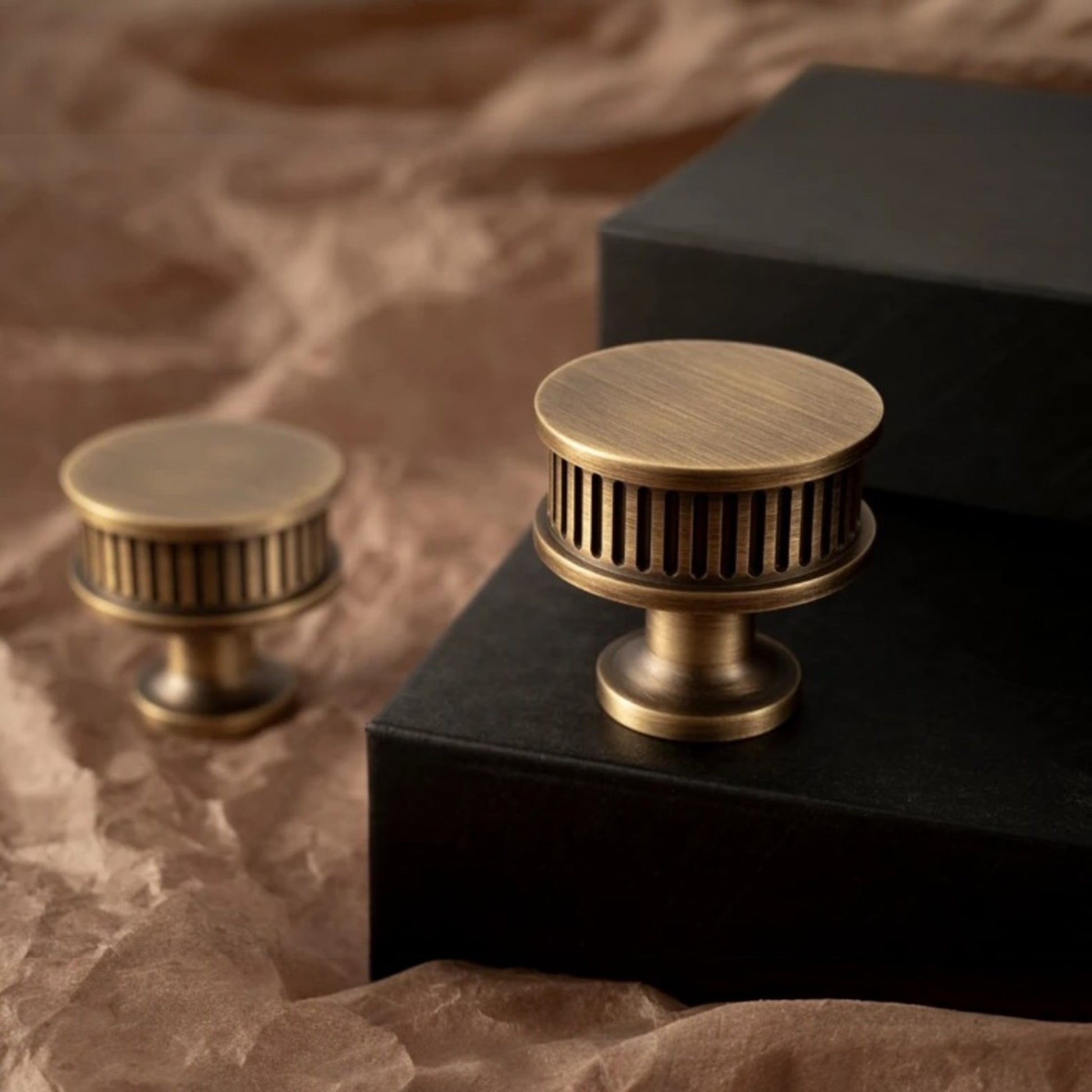 Knoppen är tillverkad i massiv mässing med en varm antikbrun ton som passar utmärkt i både moderna och klassiska miljöer. Den distinkta räfflade sidan ger ett förbättrat grepp och en exklusiv känsla.